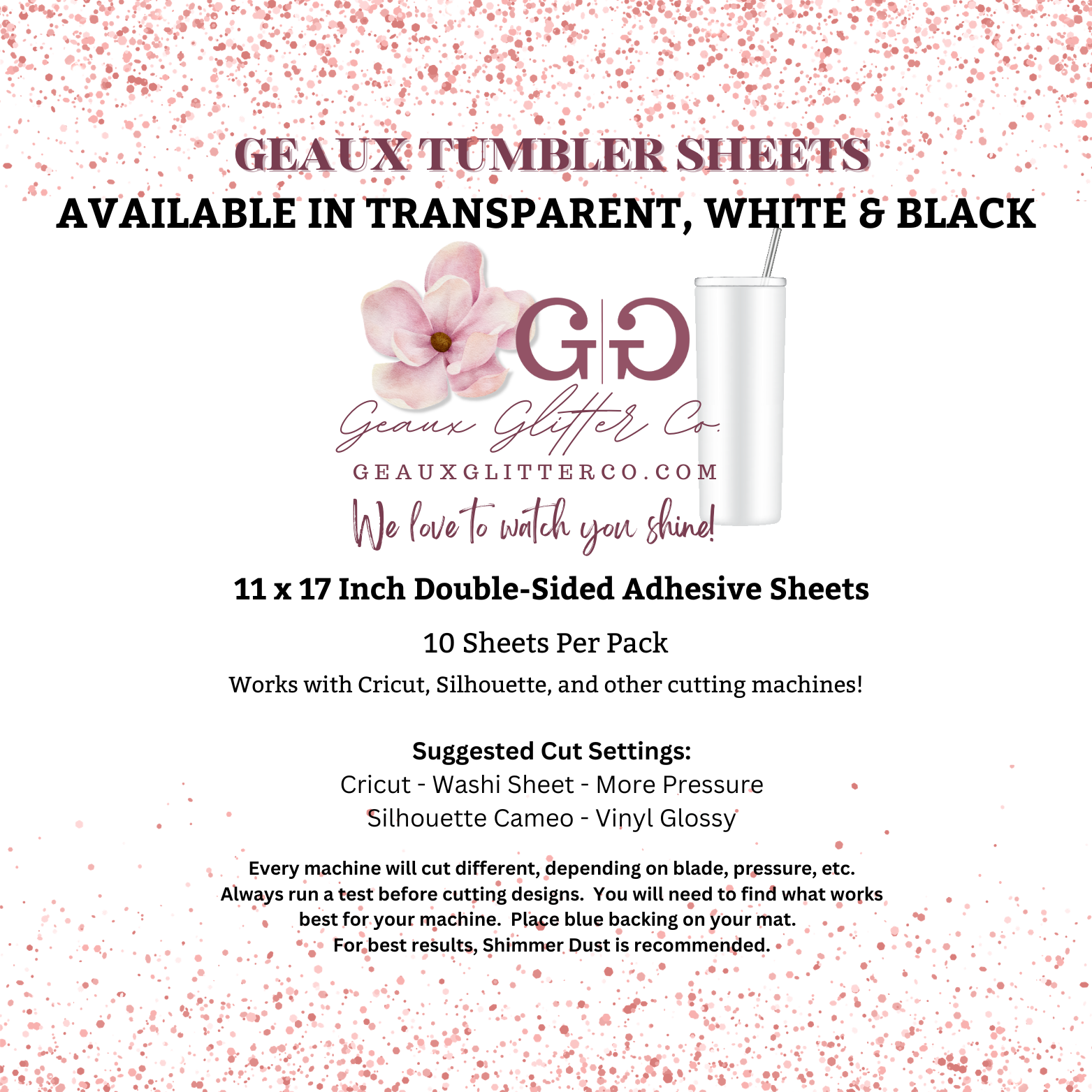We do suggest that Geaux Glitter Co.'s Shimmer Dust or Fine glitter works best on Geaux Tumbler Sheets. The options are limitless with Geaux Tumbler Sheets.